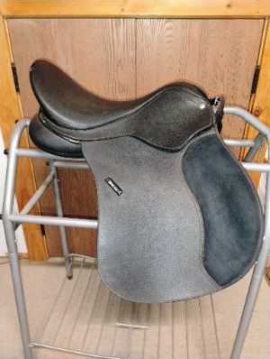 This saddle is like new, with very few rides in it. Practicality and comfort at its best. With a supportive seat and a durable leather look for easy care. Super soft panels that mold in and around your horse's muscles, hugging their conformation. Changeable gullet has a black medium gullet in the saddle. This saddle has an added balance strap. There is only 1 flaw in the saddle at the tip of the cantle.