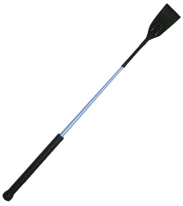 English style bat with molded rubber grip handle and cap has a polyethylene covered fiberglass shaft and leather flap.